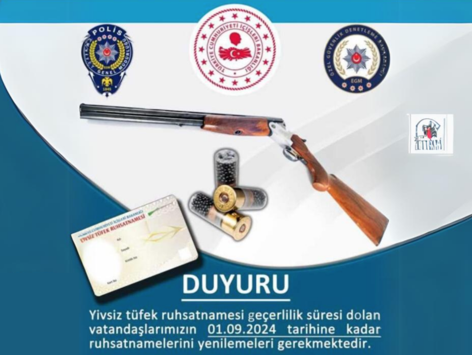 Eminyet Genel Müdürülüğü’nden yapılan duyuruya göre, Yivsiz tüfek ruhsatnamelerinin geçerlilik süreleri dolmuş vatandaşlarımızın 01.09.2024 tarihine kadar ruhsatnamelerinin yenilemeleri gerekmektedir
