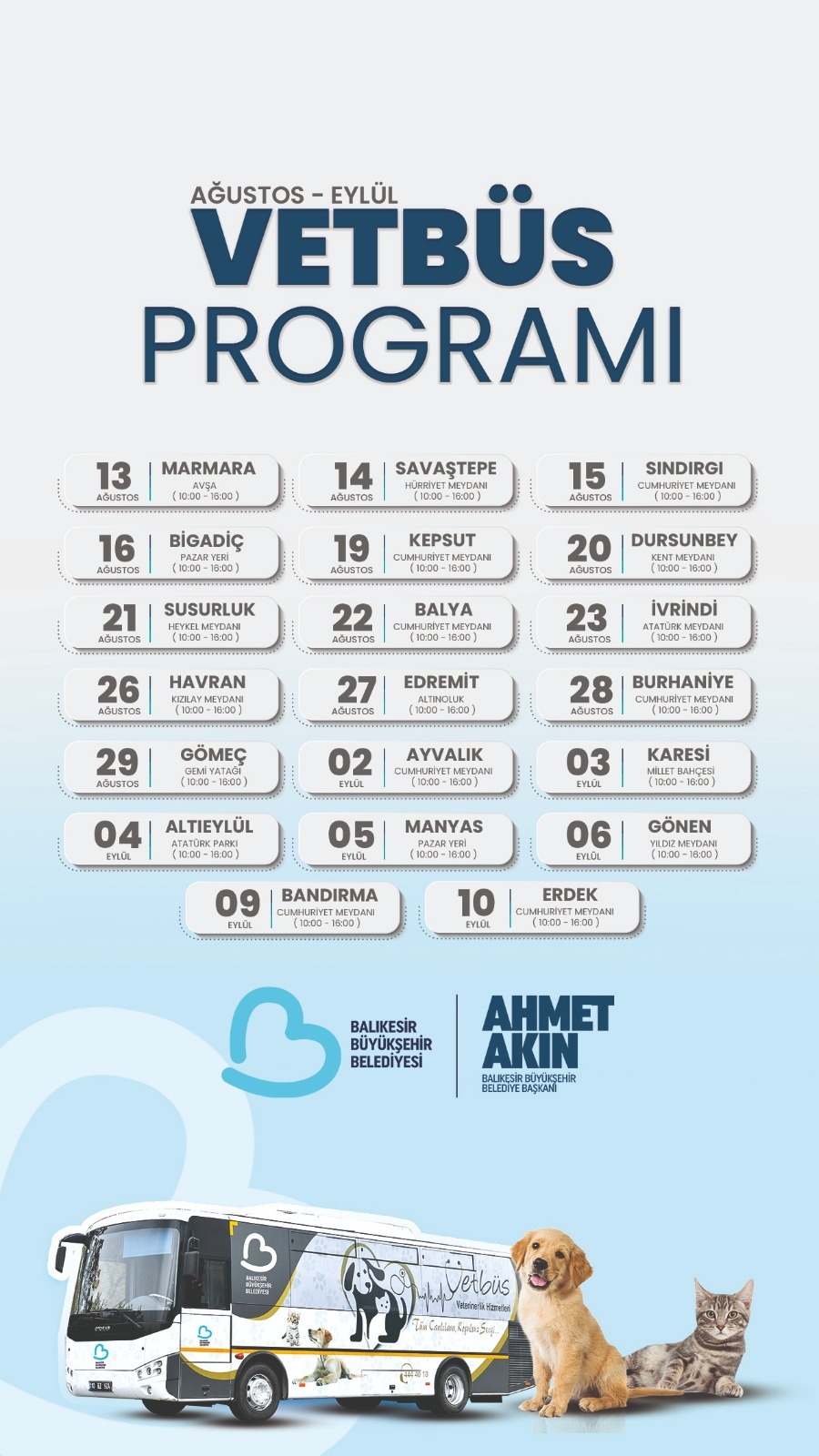 13 Ağustos’ta Marmara Adası Avşa’dan yolculuğa başlayan VETBÜS; 14 Ağustos Savaştepe Hürriyet Meydanı, 15 Ağustos Sındırgı Cumhuriyet Meydanı, 16 Ağustos Bigadiç Pazar Yeri, 19 Ağustos Kepsut Cumhuriyet Meydanı, 20 Ağustos Dursunbey Kent Meydanı, 21 Ağustos Susurluk Heykel Meydanı, 22 Ağustos Balya Cumhuriyet Meydanı, 23 Ağustos İvrindi Atatürk Meydanı, 26 Ağustos Havran Kızılay Meydanı, 27 Ağustos Edremit Altınoluk, 28 Ağustos Burhaniye Cumhuriyet Meydanı, 29 Ağustos Gömeç Gemi Yatağı, 2 Eylül Ayvalık Cumhuriyet Meydanı, 3 Eylül Karesi Millet Bahçesi, 4 Eylül Altıeylül Atatürk Parkı, 5 Eylül Manyas Pazar Yeri, 6 Eylül Gönen Yıldız Meydanı, 9 Eylül Bandırma Cumhuriyet Meydanı ve 10 Eylül’de Erdek Cumhuriyet Meydanı’nda olacak.