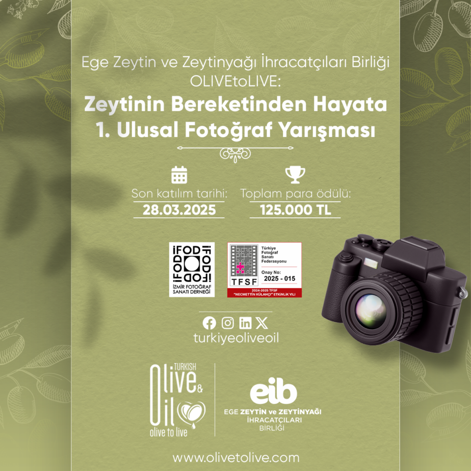 Zeytin ve zeytinyağının bereketin simgesi özelliği yanında Anadolu’daki kadim yolculuğuna ve yaşama kattığı anlamlara dikkat çekmeyi amaçlayan Ege Zeytin ve Zeytinyağı İhracatçıları Birliği, İzmir Fotoğraf Sanatı Derneği (İFOD) ve Türkiye Fotoğraf Sanatı Federasyonu (TFSF) iş birliğiyle “OLIVEtoLIVE” isimli fotoğraf yarışması düzenliyor.