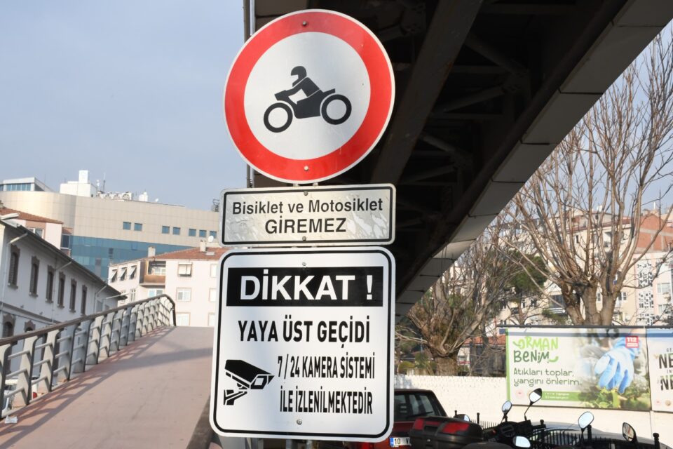 Balıkesir’de Çarşı ile Atatürk Parkı’nı birbirine bağlayan üst geçitte motosiklet ve bisiklet girişinin yaya geçişini tehlikeye düşürdüğünü söyleyen Balıkesir Büyükşehir Belediyesi Zabıta Dairesi Başkanı Bülent Mavuk, “Vasıf Çınar Caddesi üzerinde bulunan yaya üst geçidi üzerinde motosiklet ve bisiklet girişini engellemek amacıyla 7/24 izleme yapan kamera sistemi kurularak yayaların üst geçitten daha güvenli geçişini sağlamayı hedeflemekteyiz.Ekiplerimiz ile yapacağımız uygulamalar ile köprü üzerinden geçen motosiklet ve bisikletlilere uyarılarımızı yapacağız. Balıkesir Büyükşehir Belediye Başkanımız Ahmet Akın’ın önderliğinde halkımızın güvenliği ve huzuru için gece gündüz demeden çalışmalarımızı sürdüreceğiz” ifadelerini kullandı.
