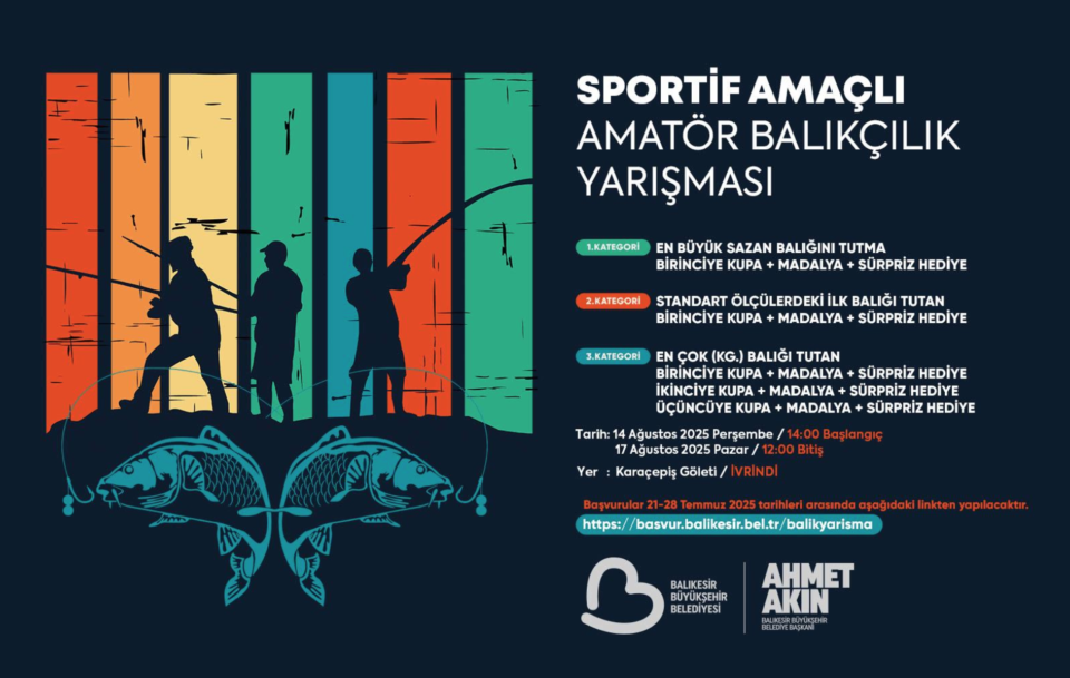 Balıkesir Büyükşehir Belediyesi, spor kültürünün yaygınlaşması ve amatör olta balıkçılığının gelişmesi amacıyla 14-17 Ağustos 2025 tarihleri arasında İvrindi’nin Karaçepiş Göleti’nde düzenleyeceği yarışmada amatör olta balıkçılarını buluşturacak. Amatör balıkçılık ruhunu geliştirmek, olta balıkçılarını bir araya getirerek kaynaşmalarını sağlamak ve yarışma kültürü anlayışını geliştirmek için planlanan yarışmada ilk üçe giren yarışmacılara kupa, madalya ve sürpriz ödüller takdim edilecek. Ücretsiz olan yarışmanın son başvuru tarihi 28 Temmuz 2025 Pazartesi olarak belirlenmiş olup https://basvur.balikesir.bel.tr/balikyarisma linki üzerinden başvurular gerçekleştirilecek.