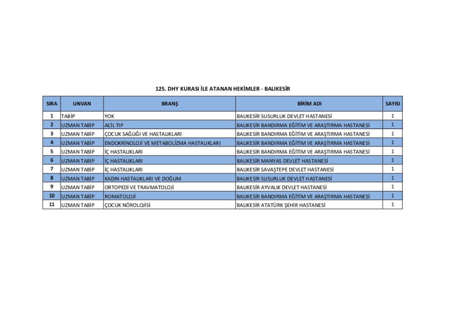Atamalar kapsamında; 1 Çocuk Nörolojisi, 1 Romatoloji, 1 Endokrinoloji ve Metabolizma Hastalıkları Yan Dal Uzmanı, 1 Acil Tıp, 1 Çocuk Sağlığı ve Hastalıkları, 3 İç Hastalıkları, 1 Kadın Hastalıkları ve Doğum ile 1 Ortopedi ve Travmatoloji branşlarında görev yapacak uzman hekimler Balıkesir ve ilçelerinde hizmet verecek.