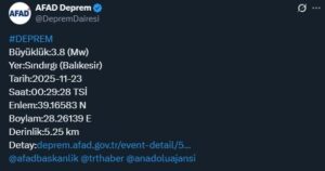 Depremin büyüklüğü ise 3.8 olarak açıklandı. AFAD’ın açıkladığı veriler şöyle: