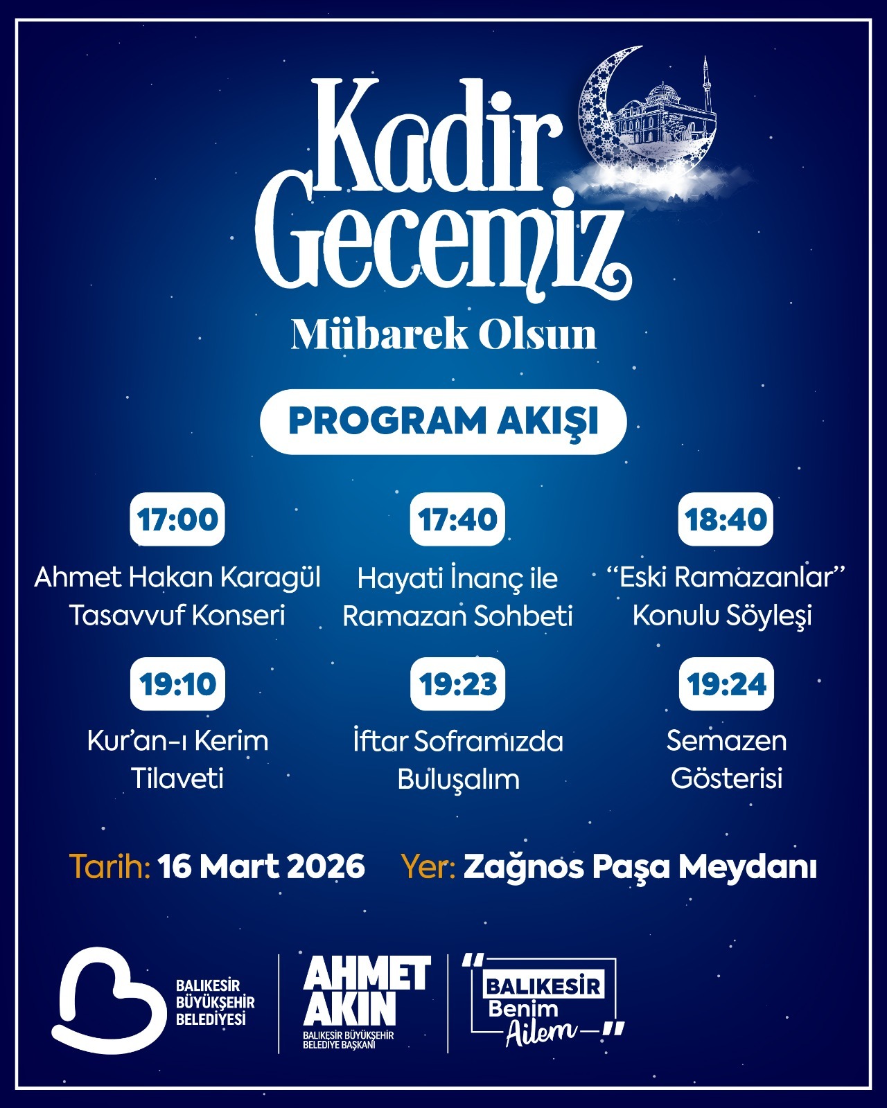 Balıkesir Büyükşehir Belediyesi tarafından bin aydan hayırlı kabul edilen Kadir Gecesi’nde gerçekleşecek programda birlik, beraberlik ve dayanışma duygusuyla on binlerce Balıkesirli aynı sofrada oruç açacak. 16 Mart Pazartesi günü Zağnos Paşa Meydanı’nda gerçekleştirilecek olan Kadir Gecesi programında tasavvuf konserinden Ramazan sohbetlerine kadar birçok program yediden yetmişe herkesi bir araya getirecek. Tanınmış yazar Hayati İnanç samimi ve içten sohbetiyle Ramazan’ın bereketini konuklarla paylaşacak. Kadir Gecesi’nde; Zağnos Paşa Camii, İmam Birgivi Camii, Arabacıoğlu Camii, Adnan Menderes Camii, Hatipler Camii, Plevne Camii, Eski Camii, İmam Hatip Camii, Hasan Baba Camii ve Kudüs Camisinde gül suyu, lokum ve kandil simidi ikramları yapılacak.