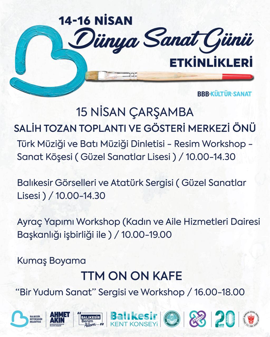 Balıkesir Büyükşehir Belediyesi tarafından 15 Nisan Dünya Sanat Günü kapsamında dolu dolu bir program hazırlandı. Balıkesir Üniversitesi Güzel Sanatlar Fakültesi, T.C. Ziraat Bankası Güzel Sanatlar Lisesi ve ilgili kurumların iş birliğiyle 14-16 Nisan tarihleri arasında sergilerden atölyelere, sokak tiyatrosundan müziğe kadar sanatın her rengi sanatseverlerle buluşacak. Program, farklı yaş gruplarına hitap eden uygulamalı sanat atölyeleri, sergiler, müzik dinletileri, tiyatro çalışmaları ve açık alan performanslarından oluşurken şehrin çeşitli noktalarında eş zamanlı olarak gerçekleşecek.